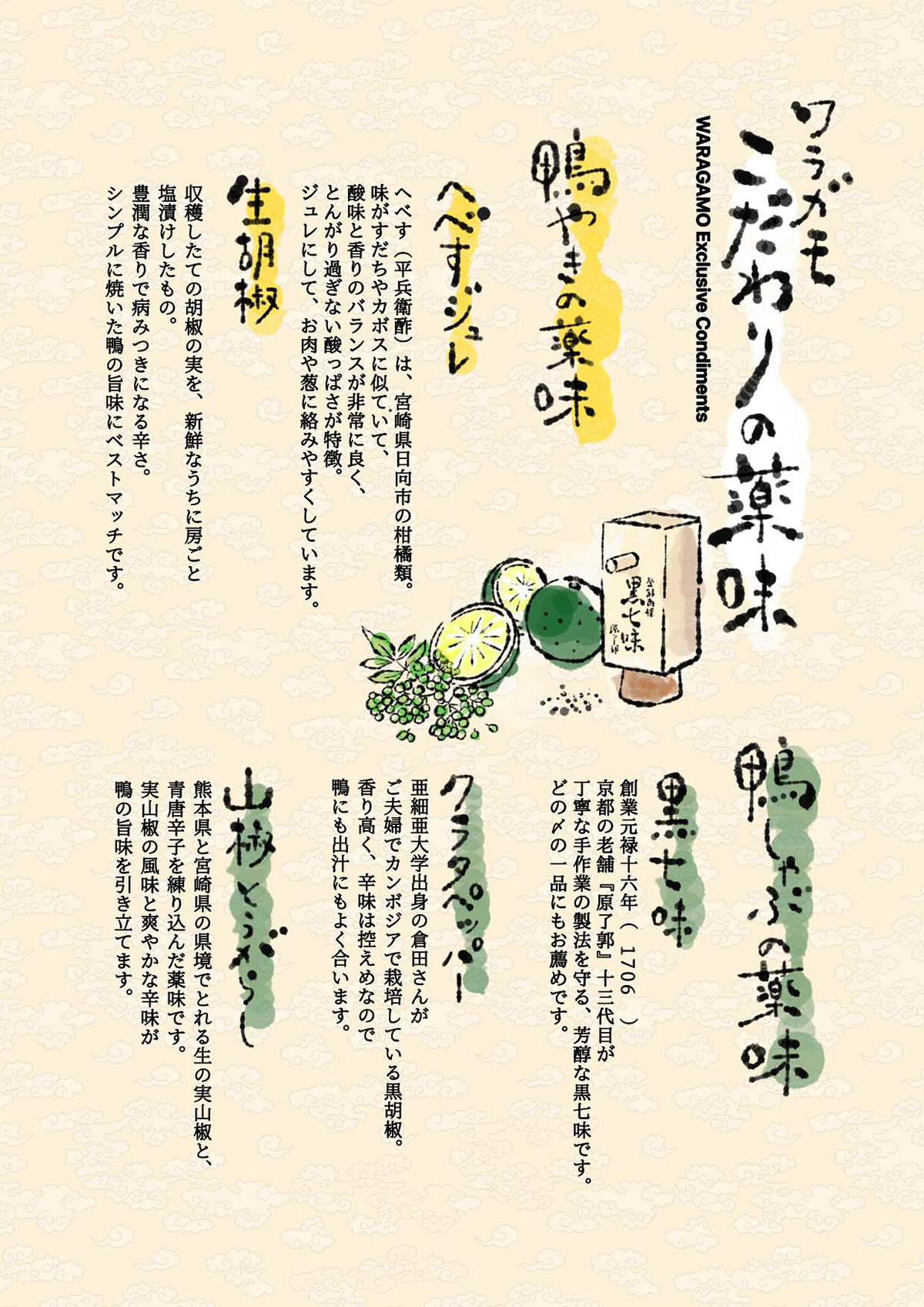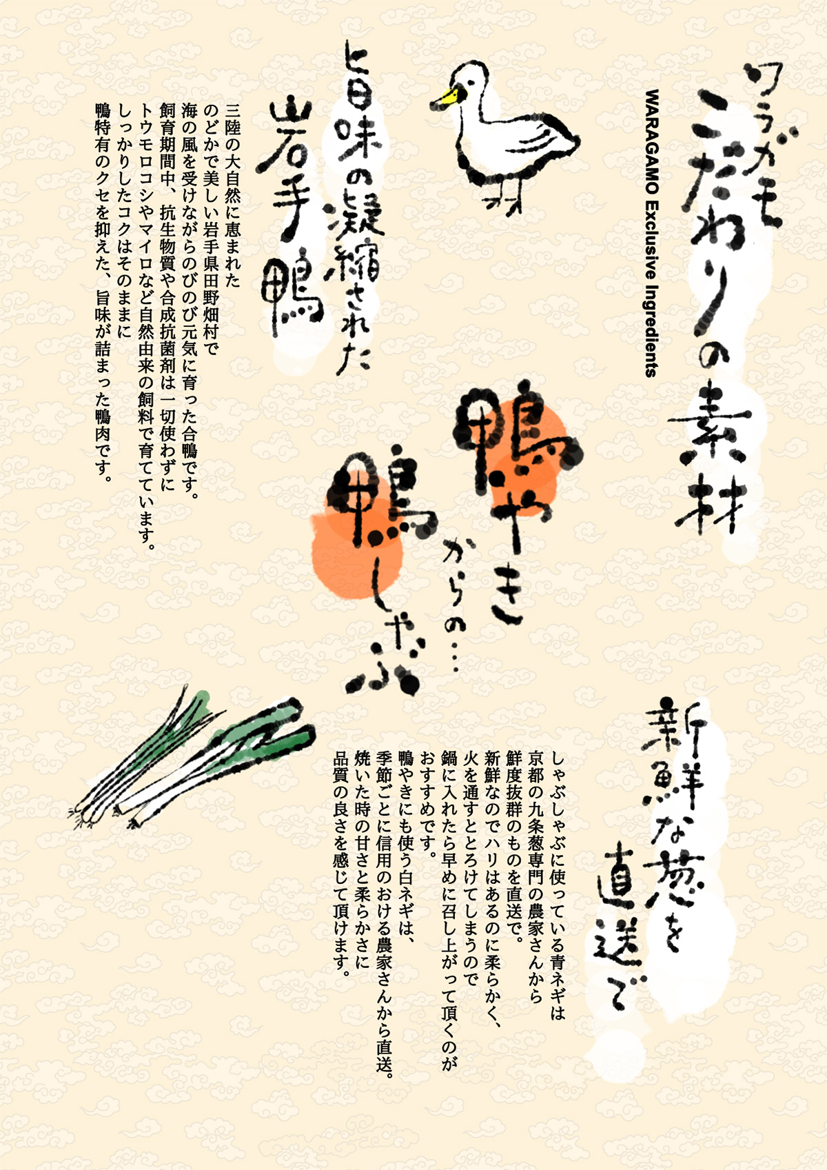 ワラガモでは丁寧に「藁燻製」した鴨肉をしゃぶしゃぶにします。鴨の脂と共にほのかに香る燻製香をお楽しみください。